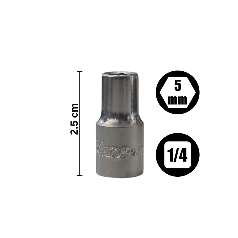 بکس کوتاه 6 پر درایو 1/4 سایز 5 میلیمتر از محصولات شرکت هنس (Hans) است. این بکس کوتاه با طراحی شش پر مناسب برای پیچ و مهرههای با سایز 5 میلی متر میباشد.