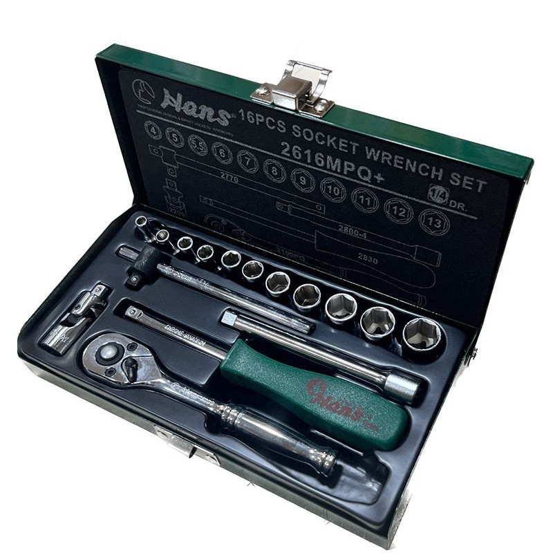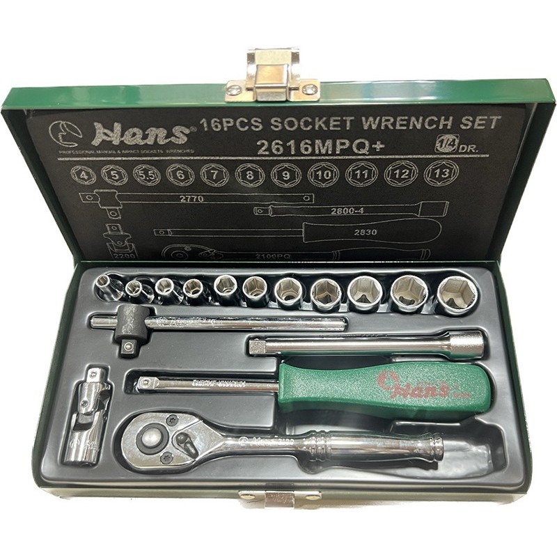 جعبه بکس 16 پارچه (هواگیری) درایو 1/4 برند هنس مدل 2616MPQ از جنس کروم وانادیوم یکی از ابزارهای دستی است که برای تعمیر و نگهداری انواع خودروها، ماشین آلات و تجهیزات صنعتی استفاده می شود.