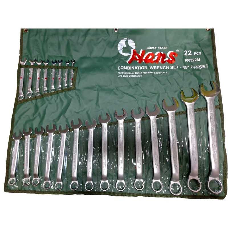 ست 22 پارچه آچار یکسر تخت یکسر رینگی هنس Hans مدل 166322M شامل 22 قطعه آچار یکسر تخت و یکسر رینگی با سایز و اندازه های مختلف است. این ست برای استفاده در تعمیر و نگهداری انواع خودروها، ماشین آلات و تجهیزات صنعتی طراحی شده است.آچارهای این ست از جنس کروم وانادیوم ساخته شده اند که باعث می شود مقاومت بالا و عمر طولانی آنها تضمین شود. همچنین سایز و اندازه هر آچار روی آن نوشته شده است، که باعث می شود شما بتوانید به راحتی آن را شناسایی کنید.