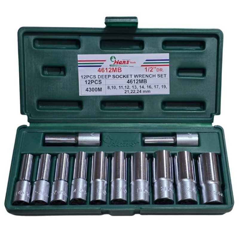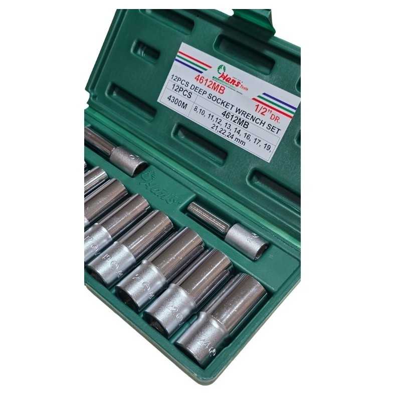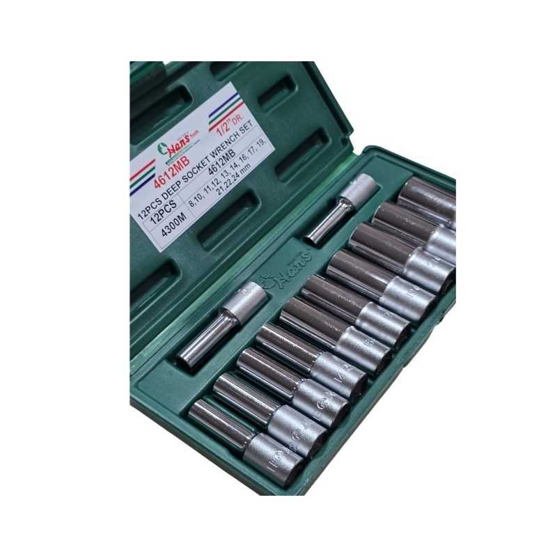 ست جعبه بکس بلند 12 پارچه درایو 1/2 هنس HANS مدل 4612MB یکی از ابزارهای دستی است که برای تعمیر و نگهداری انواع خودروها، ماشین آلات و تجهیزات صنعتی استفاده می شود. این ست شامل 12 عدد بکس بلند هنس با درایو 1/2 اینچ است که برای تنظیم و تعمیر انواع پیچ و مهره ها و اتصالات استفاده می شوند.